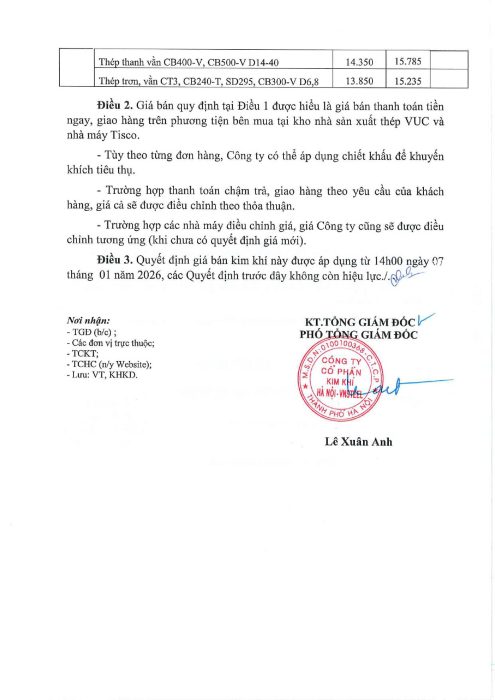 Quyết định về việc ban hành giá bán thép hình Tisco