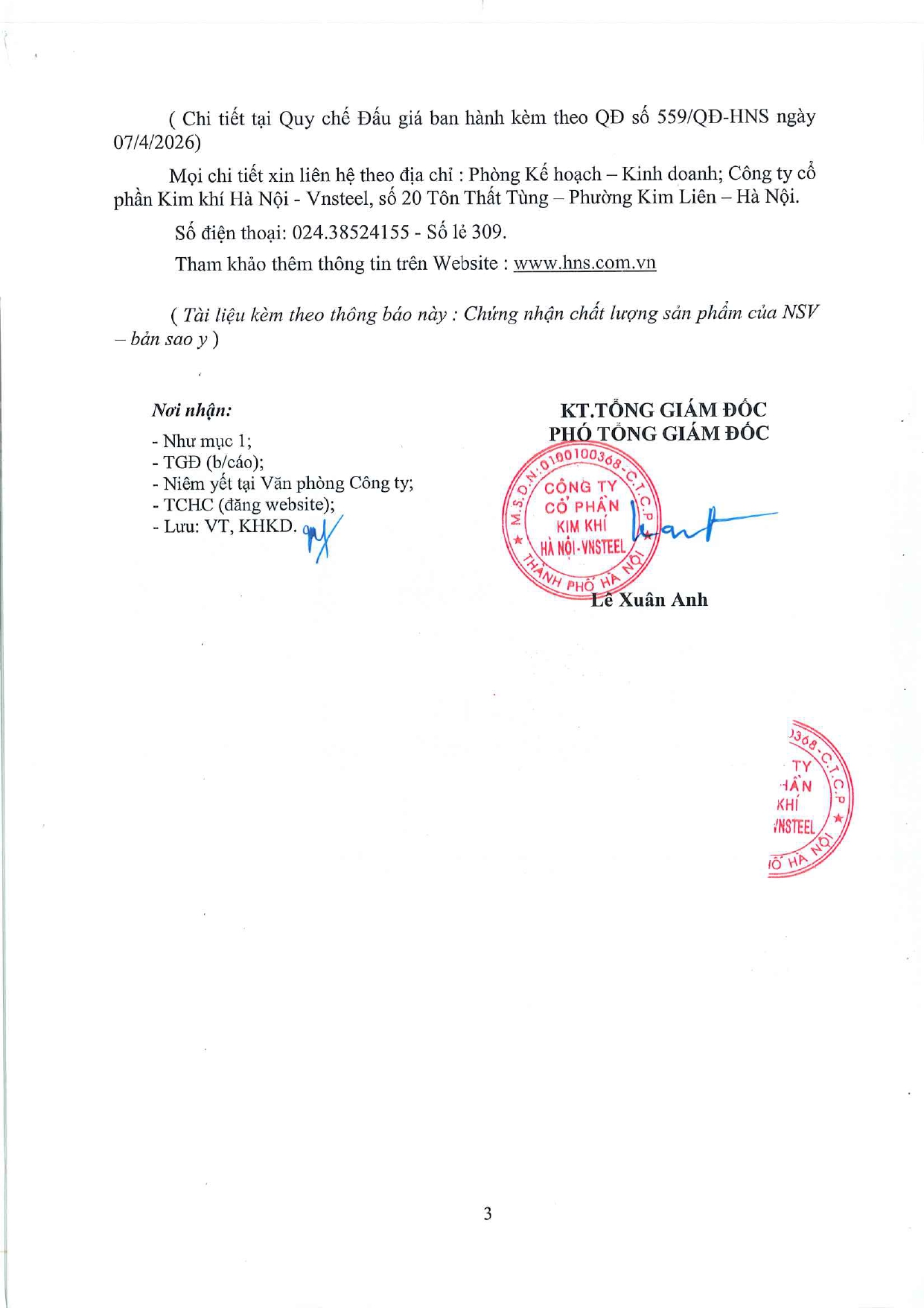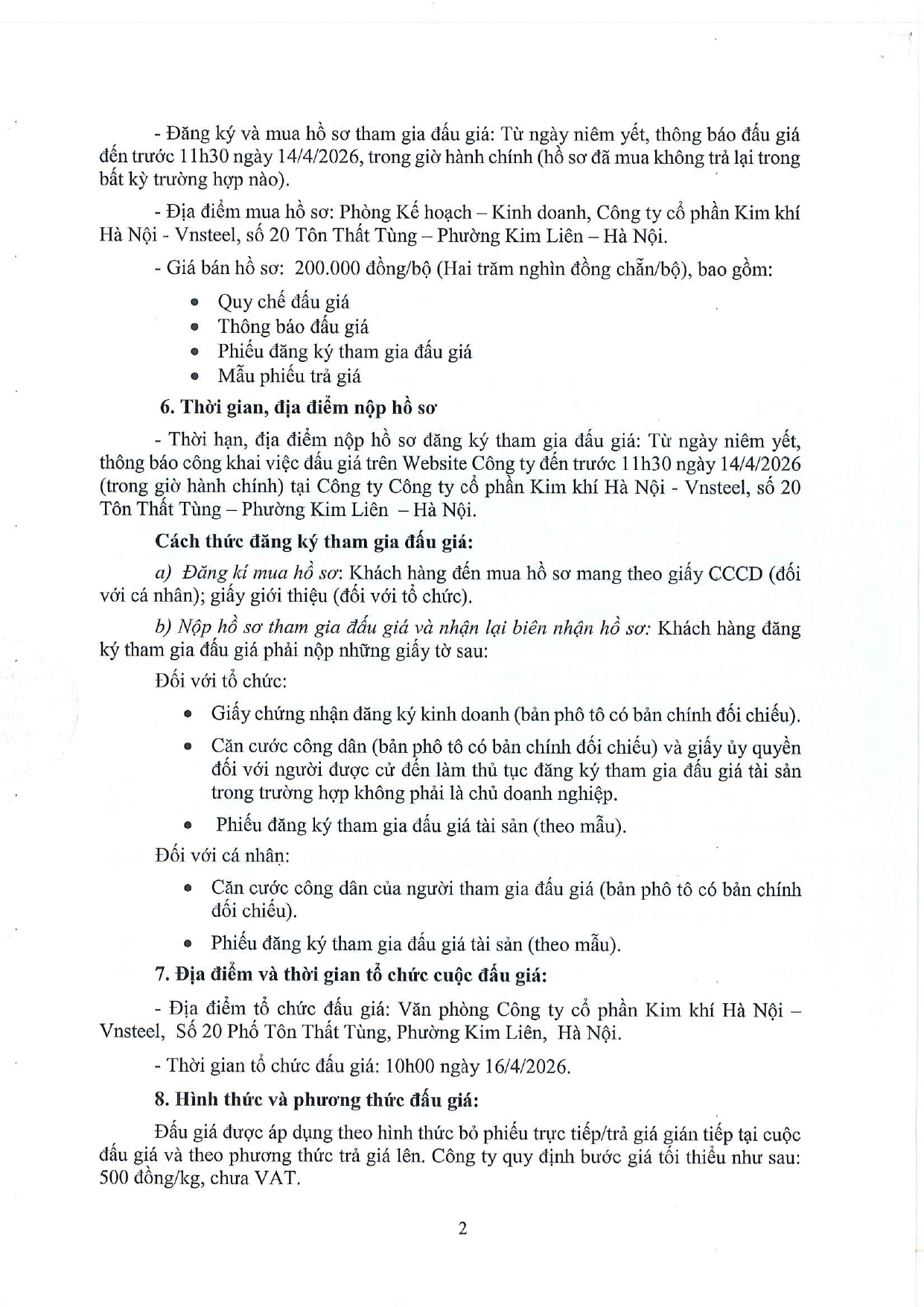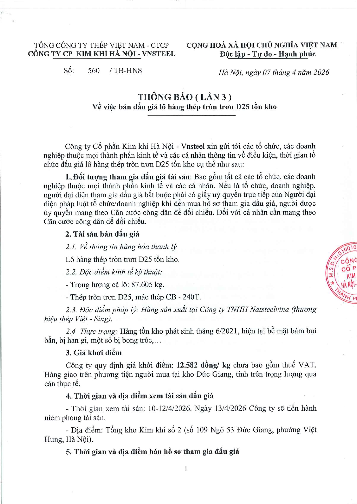 Công ty Cổ phần Kim khí Hà Nội > Tin tức > Tin tổng hợp > Tin tức kinh doanh > Thông báo về việc Đấu giá lô hàng thép tròn trơn D25 tồn kho (Lần 3)